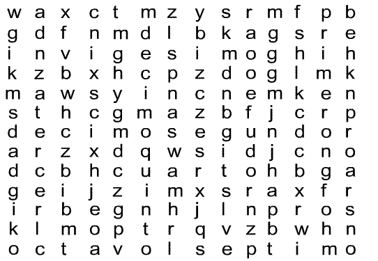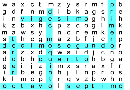Escribe el nombre del número ordinal que corresponda en los espacios vacíos y encuéntralos en la sopa de letras.